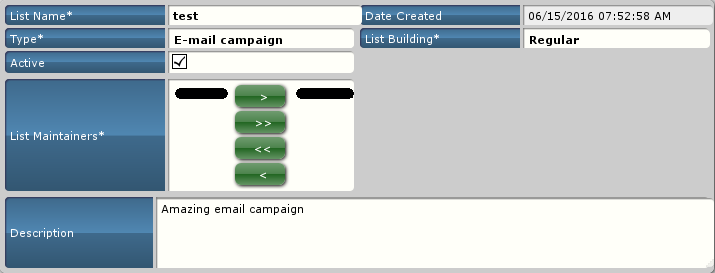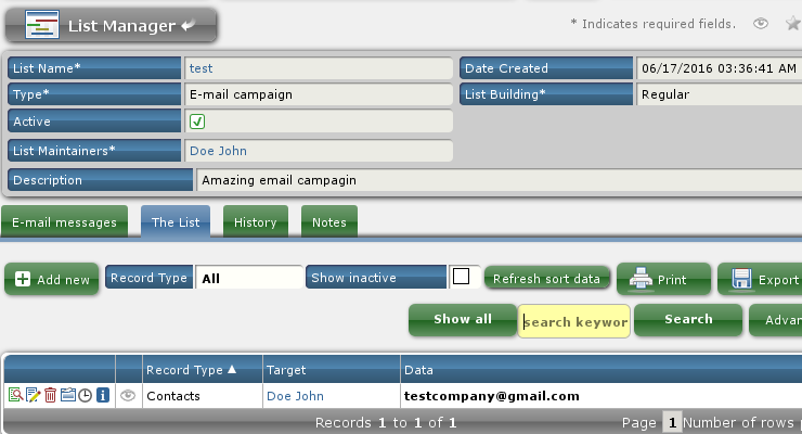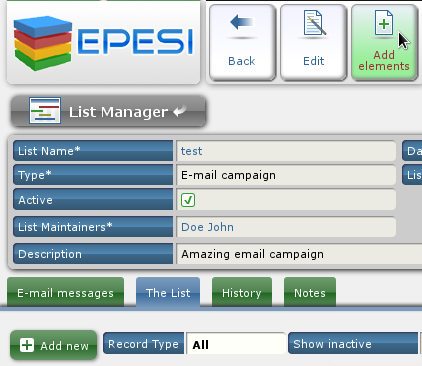 After you have created a new list record it is time to actually fill the list. In ‘The list’ tab click ‘Add elements’ actionbar or ‘Add new’.