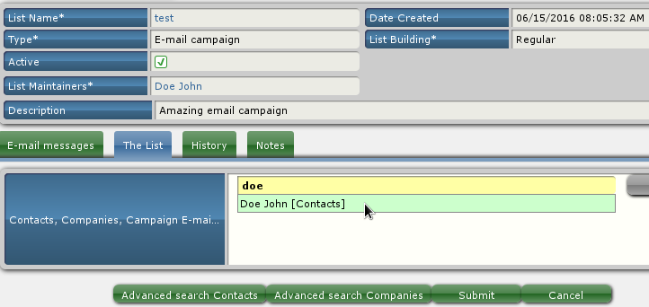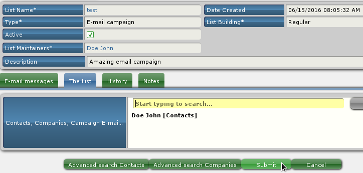 Click ‘Submit’ to save your list. Now you can use this list to send an e-mail campaign or schedule phone calls.